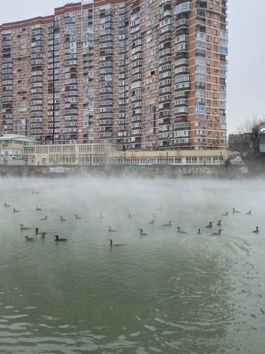 Птицам сложнее всего пережить заснеженное время года. Многие водоемы (лиманы) замерзают, и птицы вынуждены искать место для выживания. Погодные условия временно делают незамерзающие участки водоемов, такие как акватория вокруг «Солнечного острова», настоящими спасителями. Здесь бакланы могут охотиться на рыбу, которая остается их основной пищей.